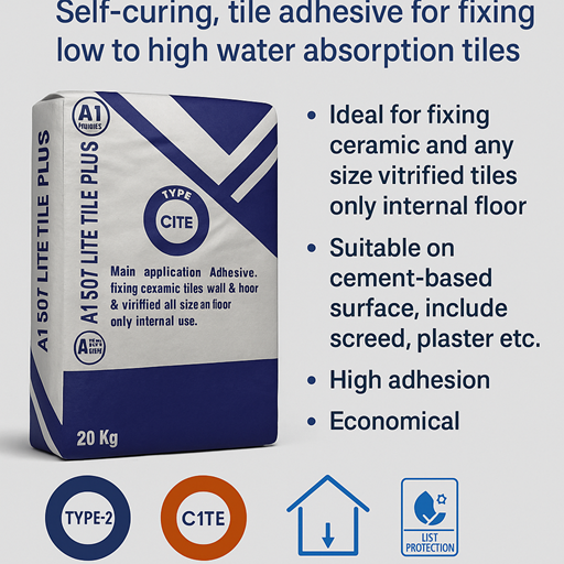 A1 507 Lite Tile Plus is a high-performance, polymer-enhanced C1TE classified tile adhesive developed for fixing low to high water-absorption tiles on internal flooring surfaces. It is specially formulated to bond ceramic tiles, vitrified tiles of any size, and other standard floor tiles efficiently and securely.